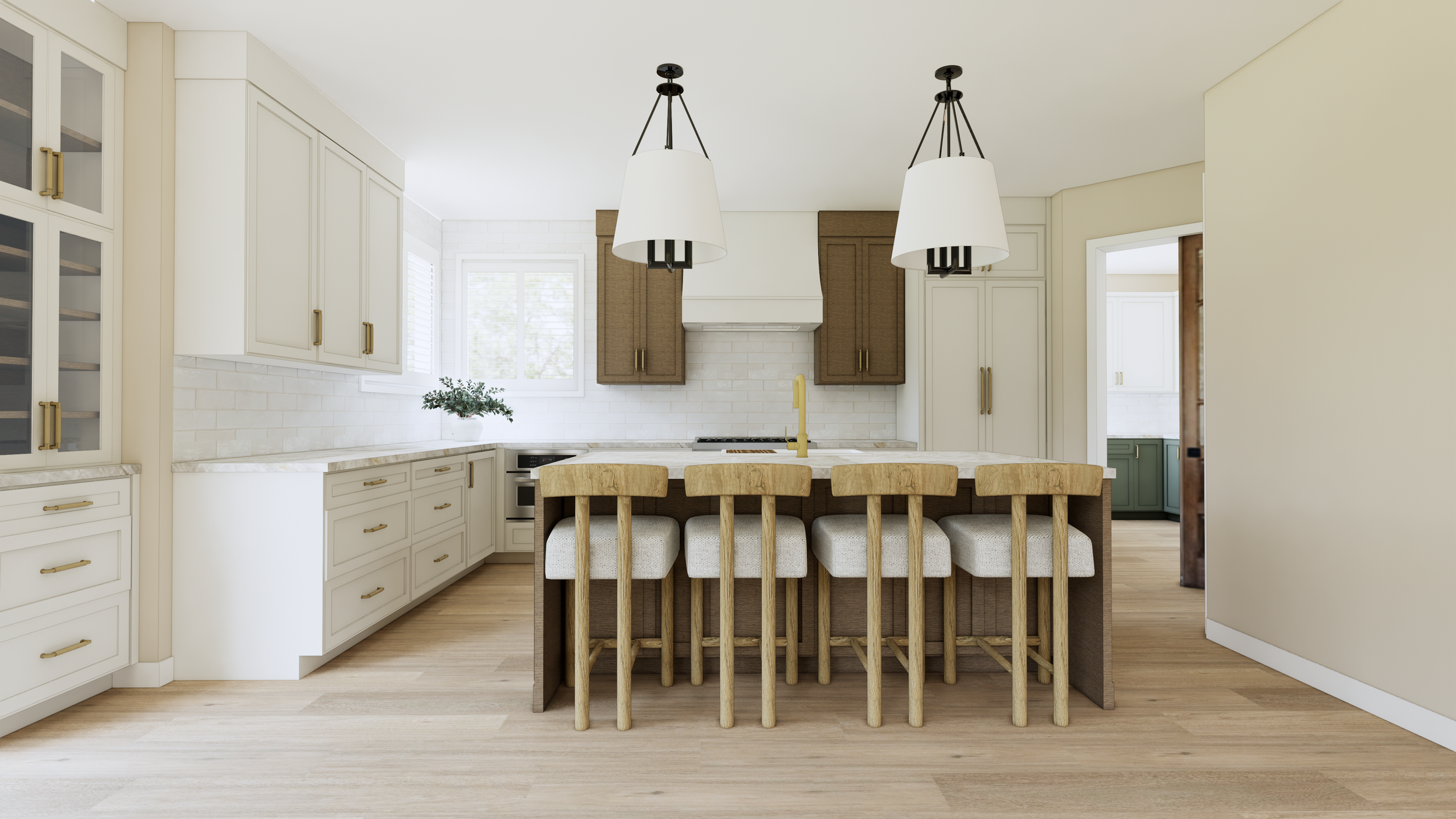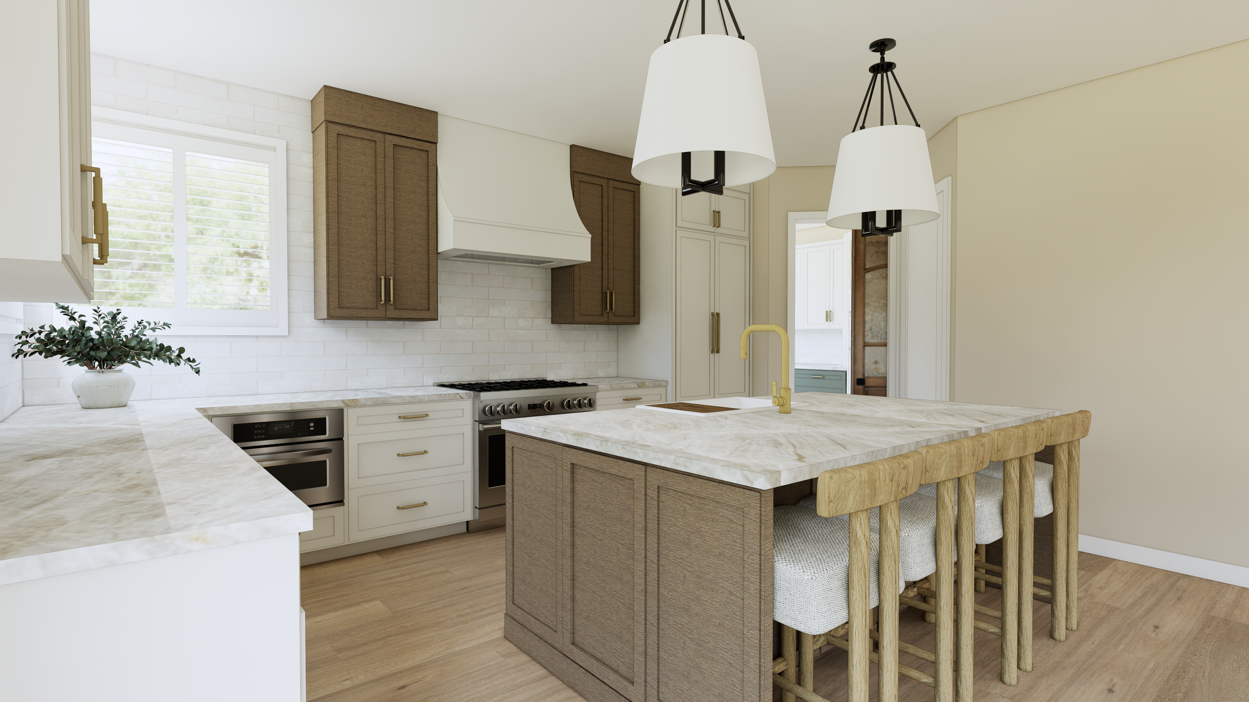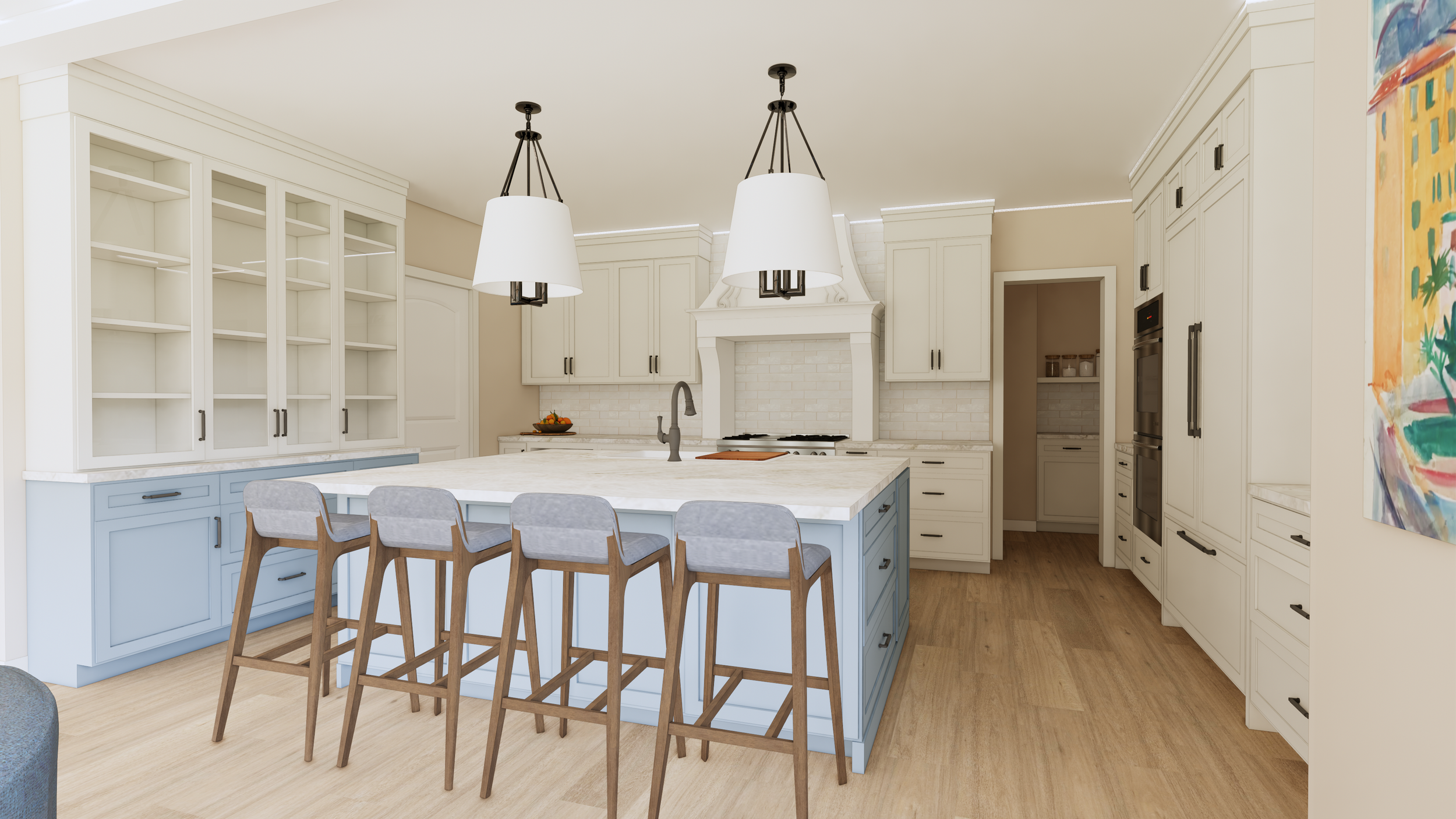 Kitchen Reconfiguration: Interior Design, Finishes, and Furnishings for this Denver home, we completely reimagined the kitchen layout to maximize both visual impact and functionality. By increasing the island size and introducing a dynamic new color palette, we brought the homeowner's dreams to life—she envisioned a sleek twist on modern French provincial style. To honor the existing charm, some of the original built-in cabinets were thoughtfully preserved and refreshed with a coordinating paint finish, seamlessly blending the old with the new. Our immersive 3D renderings gave the client a vivid preview, allowing her to truly picture how stunning her transformed home will be upon completion in 2026. New custom cabinetry via Bellmont Cabinets through Signature Designs Kitchen Bath & Interiors of Lone Tree, CO