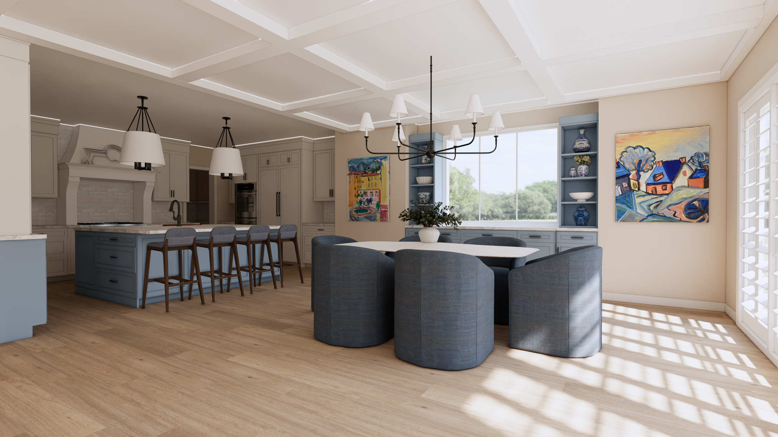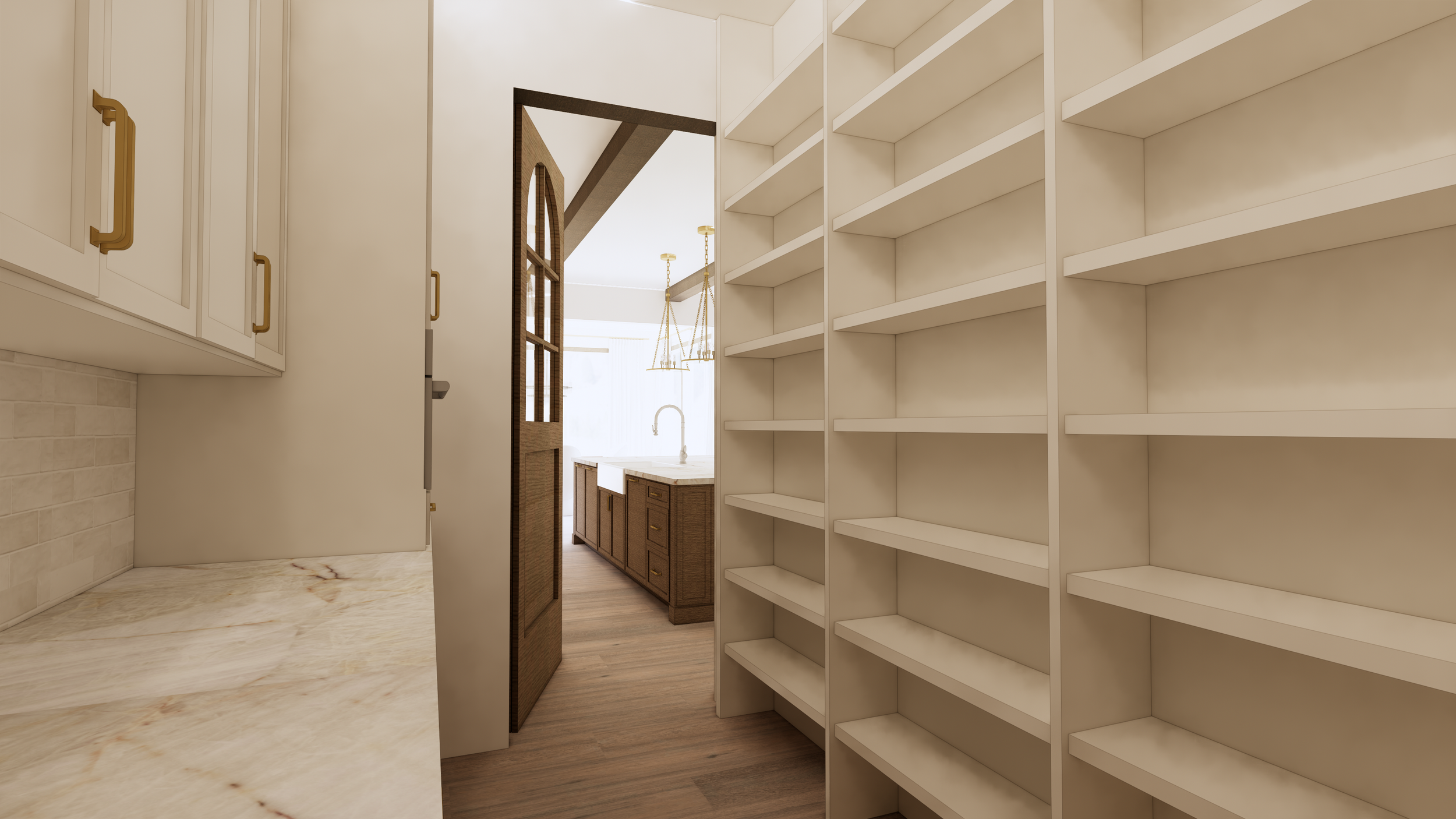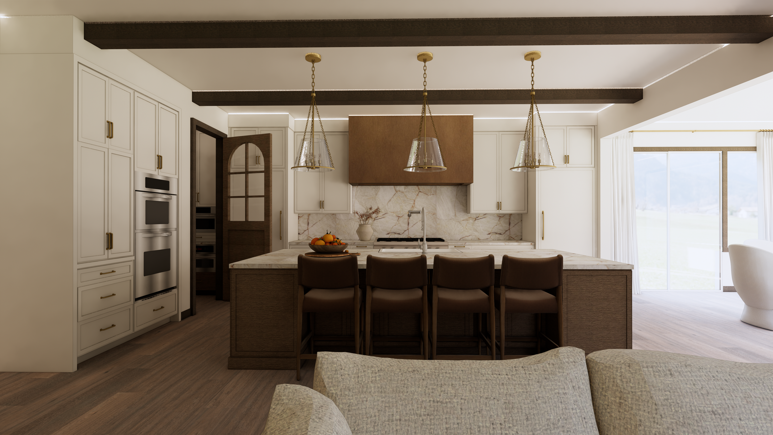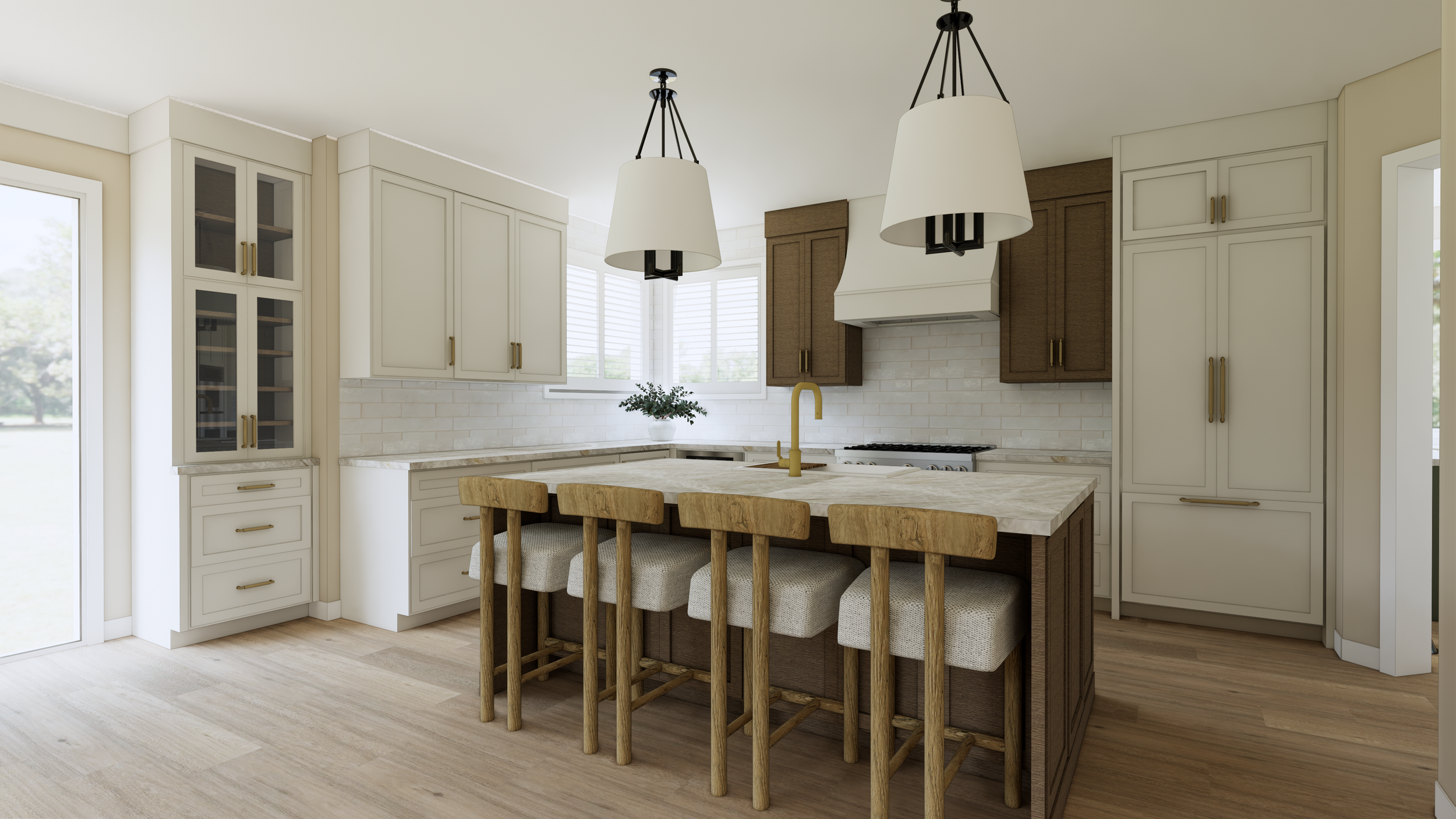 Kitchen Reconfiguration: Interior Design, Finishes, and Furnishings for this Denver home, we completely reimagined the kitchen layout to maximize both visual impact and functionality. By increasing the island size and introducing a dynamic new color palette, we brought the homeowner's dreams to life—she envisioned a sleek twist on modern French provincial style. To honor the existing charm, some of the original built-in cabinets were thoughtfully preserved and refreshed with a coordinating paint finish, seamlessly blending the old with the new. Our immersive 3D renderings gave the client a vivid preview, allowing her to truly picture how stunning her transformed home will be upon completion in 2026. New custom cabinetry via Bellmont Cabinets through Signature Designs Kitchen Bath & Interiors of Lone Tree, CO