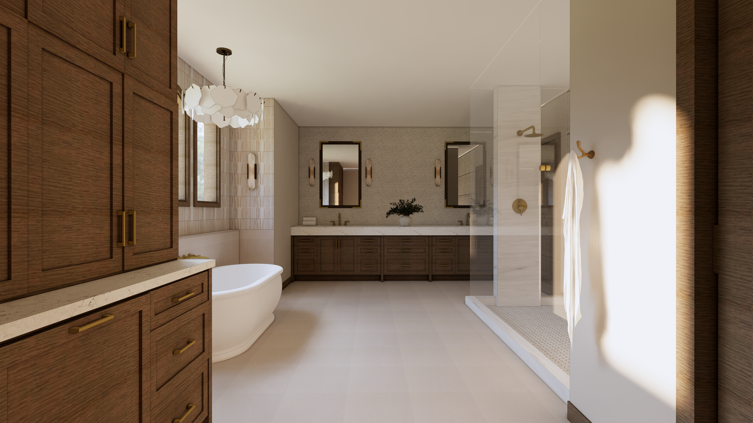 Remote Project - 2nd Project for this homeowner. Primary Suite. Bedroom - Bathroom Major Reconfiguration. Remove one small window, added 9 small windows. Moved 2 small vanities and created an 11 ft dual shower. Created a large vanity with tons of storage. New custom cabinetry via Plato Woodworks through Signature Designs Kitchen Bath & Interiors of Lone Tree, CO