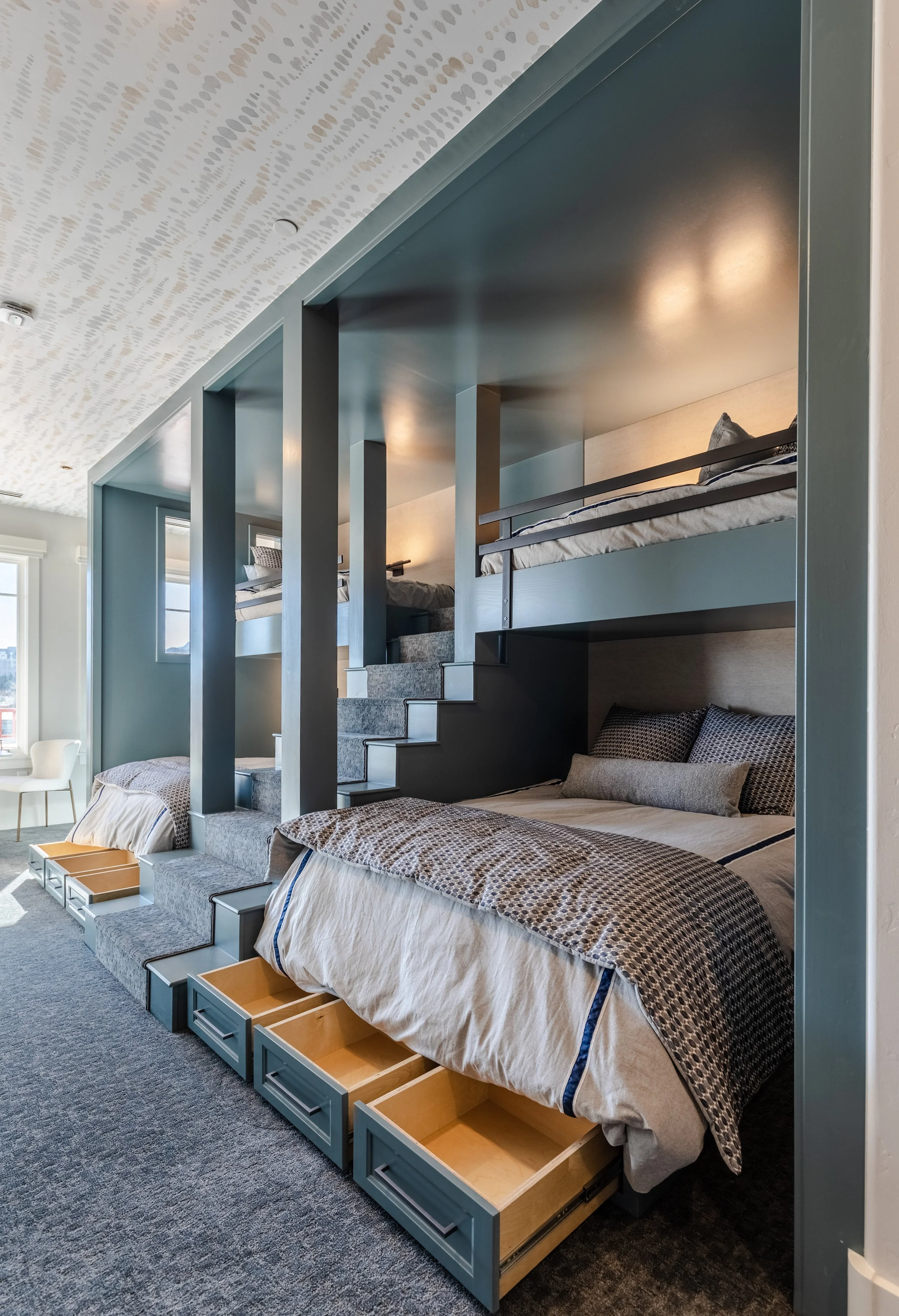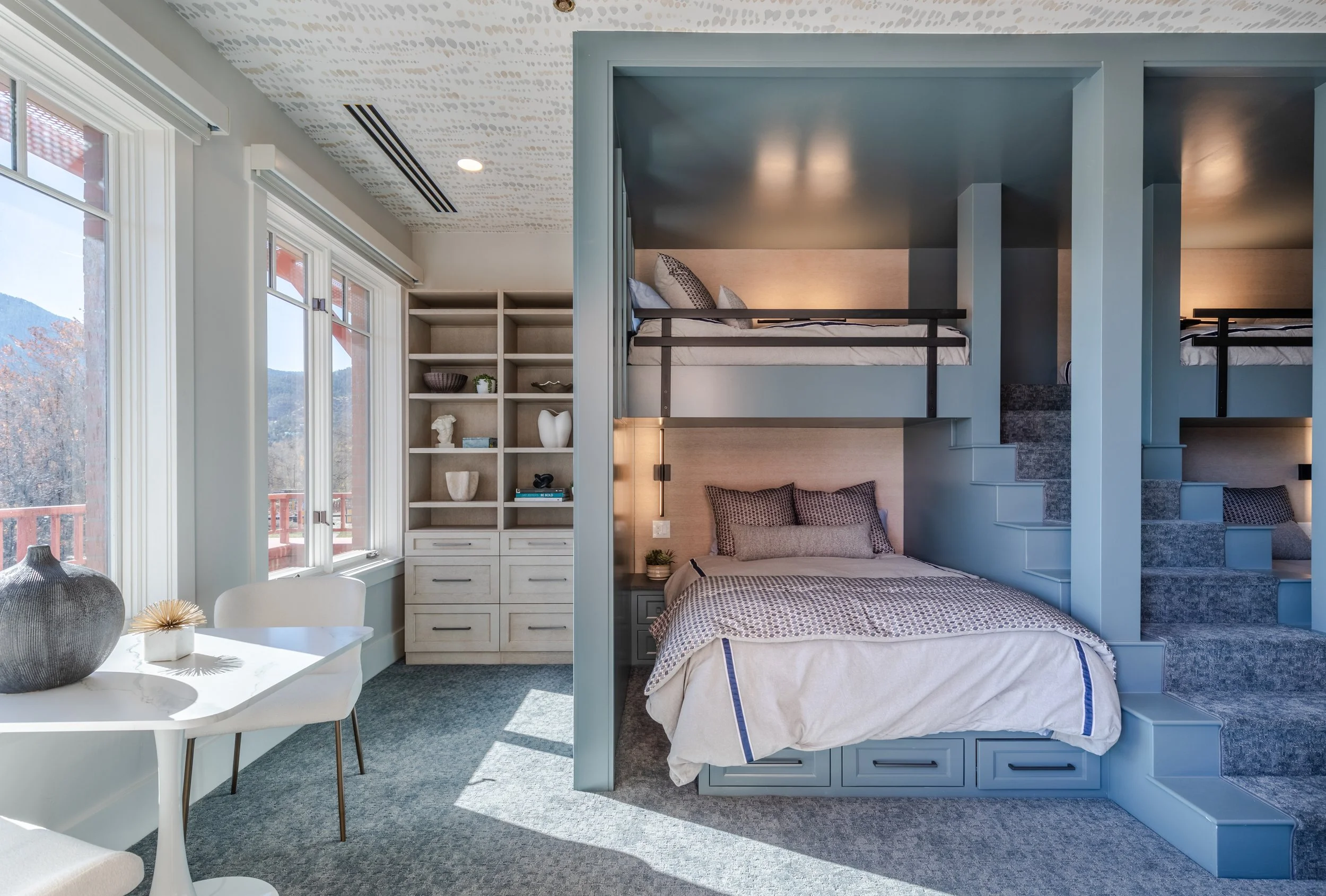 We created the bunk area of this Boulder condo to feel comfortable and accommodate either a group of children or a whole family, while maintaining a refined atmosphere suitable for adults as well. Though the space was intended for everyone, we kept a clear vision throughout the design process. The bunk room combines practicality and style, featuring a soothing neutral palette, luxurious bedding, unique lighting fixtures, ample sleeping arrangements, and a striking wood accent wall that anchors the design. Additional touches include wallpaper on the ceiling and one wall, as well as a plush slate blue carpet that completes the overall look.