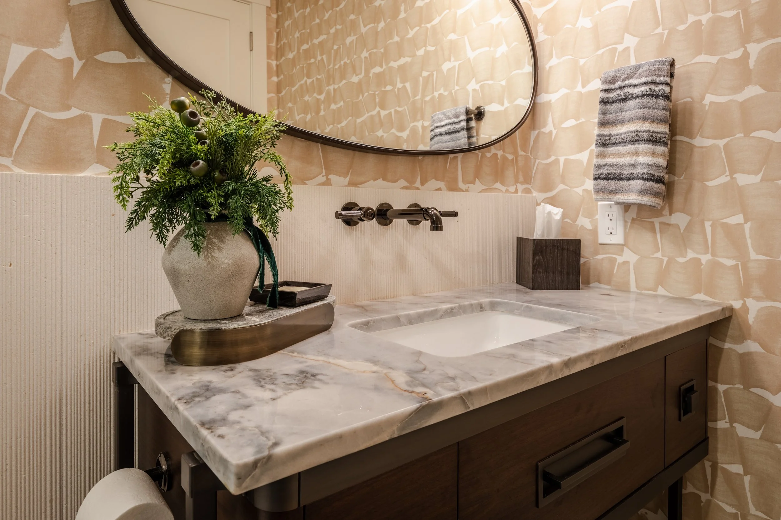 A sophisticated powder room enhances the elegance of the condo, featuring a stunning gilded vanity and a custom oval mirror sourced from New York City—an exceptional touch that will impress your guests.