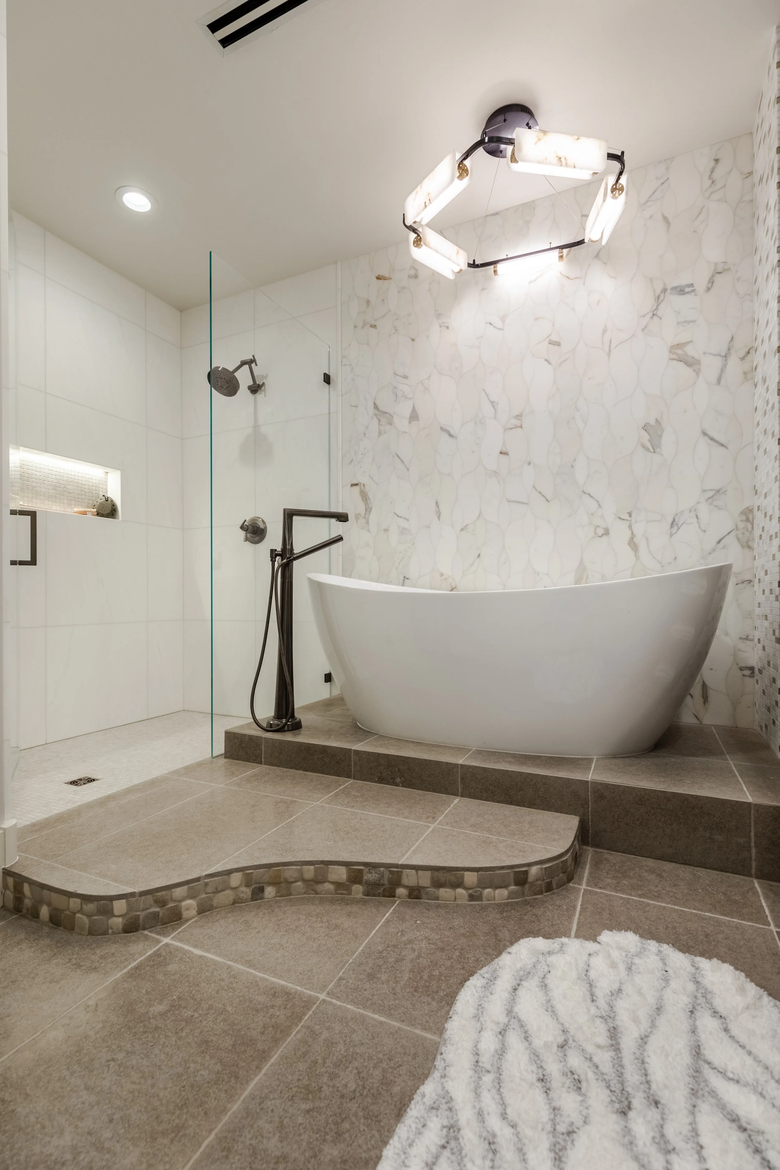 Retreat to the peaceful primary bedroom, a sanctuary designed for relaxation, featuring custom wallpaper that sets the tone for restful nights. The luxurious bathroom exudes spa-like allure.