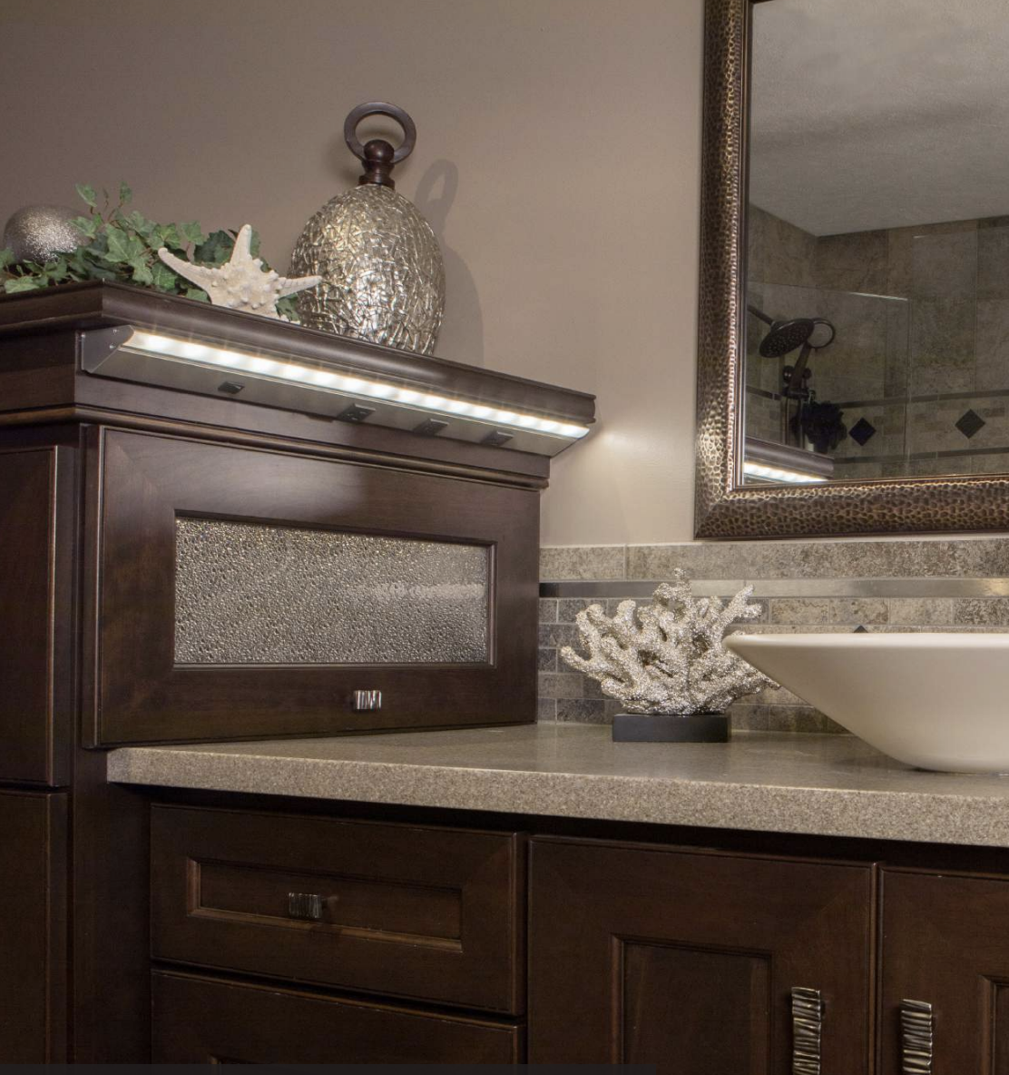 Why make them visible at all? New low-profile outlet strips can be installed up and under the upper cabinets. This keeps your backsplash clear and your kitchen looking seamless, with outlets still easily accessible for daily use.