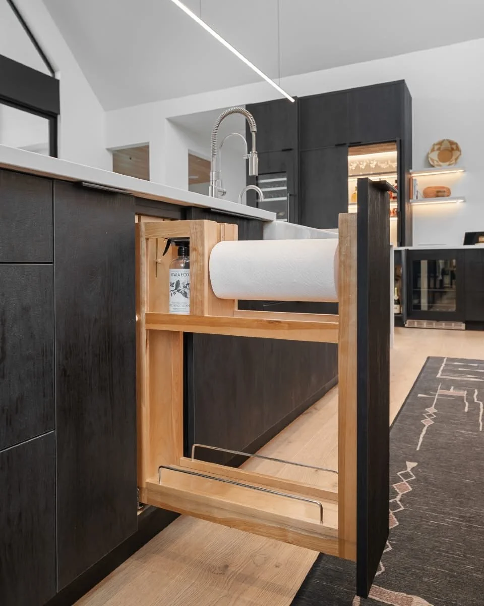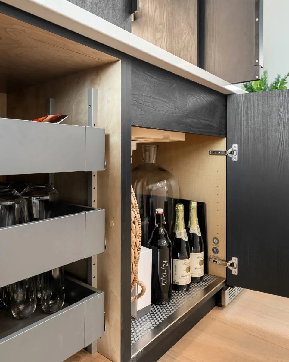Excellence in functionality is exemplified through Bellmont's full-extension drawers and roll-outs, equipped with soft-close undermount guides to ensure smooth and quiet operation—perfect for the minimalist purity of mid-century kitchens.