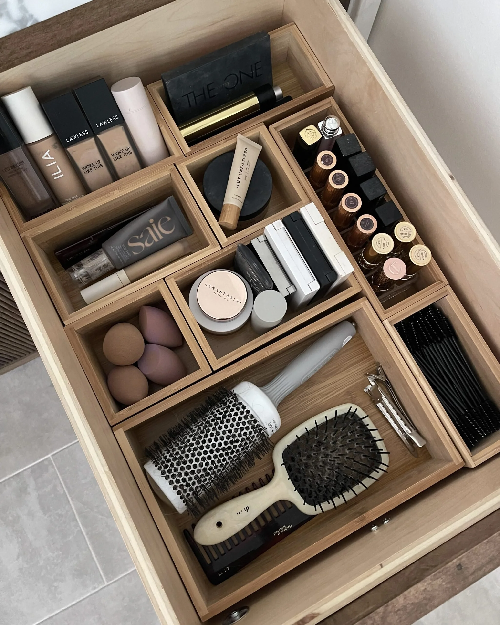 Firstly, consider installing pull-out drawers equipped with dividers inside your vanity. These aren't just any drawers; think of them as your personal organizers, where every skincare product, hairbrush, and accessory has a designated spot. By doing so, you create an orderly system that not only makes your morning routine smoother but also hides these items away, maintaining a sleek and clean appearance.