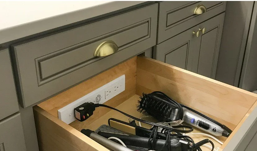 For those who cherish their beauty gadgets, integrating electrical outlets inside your vanity cabinets can be a game-changer. This innovative approach allows you to charge and store electric toothbrushes, razors, and hair styling tools discreetly, ensuring your countertops remain uncluttered and your devices are always ready for use.