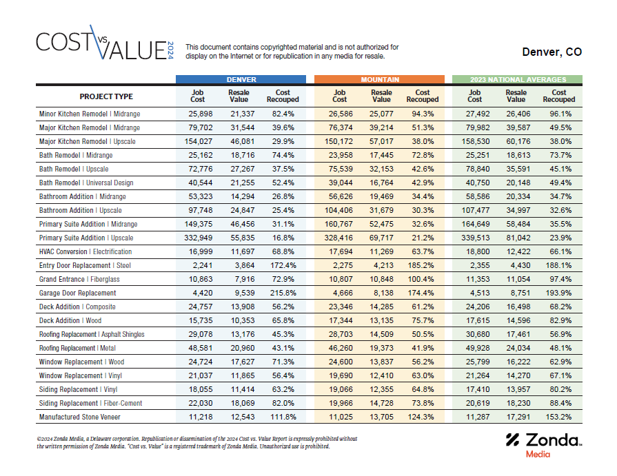 This annual report by Remodeling Magazine reflects a nation-wide study of average renovation costs. The average remodel cost is broken down by geographic area, too, giving us this specialized report for Denver, Colorado.