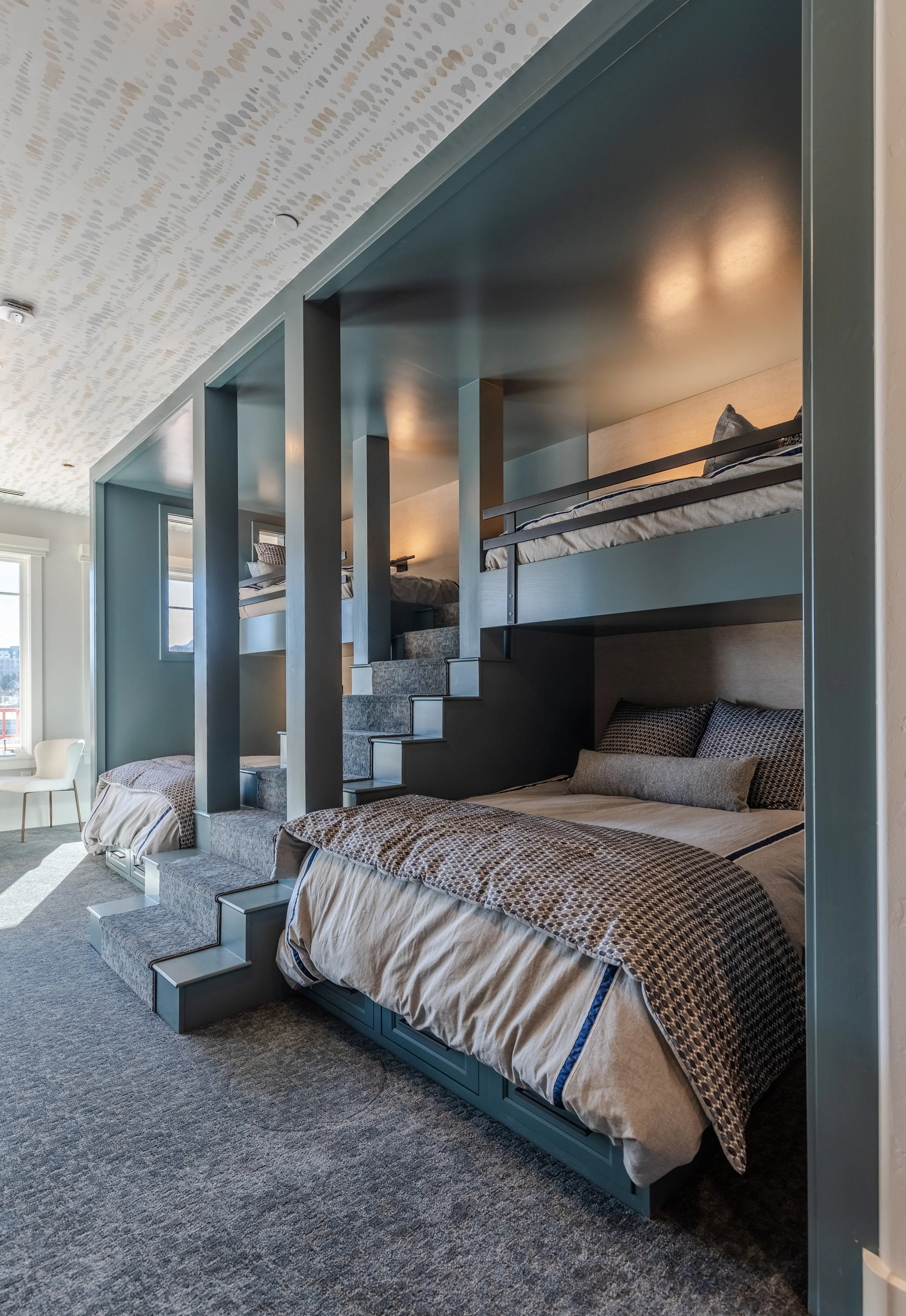 Retreat to the peaceful primary bedroom, a sanctuary designed for relaxation, featuring custom wallpaper that sets the tone for restful nights. The luxurious bathroom exudes spa-like allure, while the thoughtfully designed kids’ wing boasts custom-built bunk beds, encouraging playful adventures in a structured and stylish environment.
