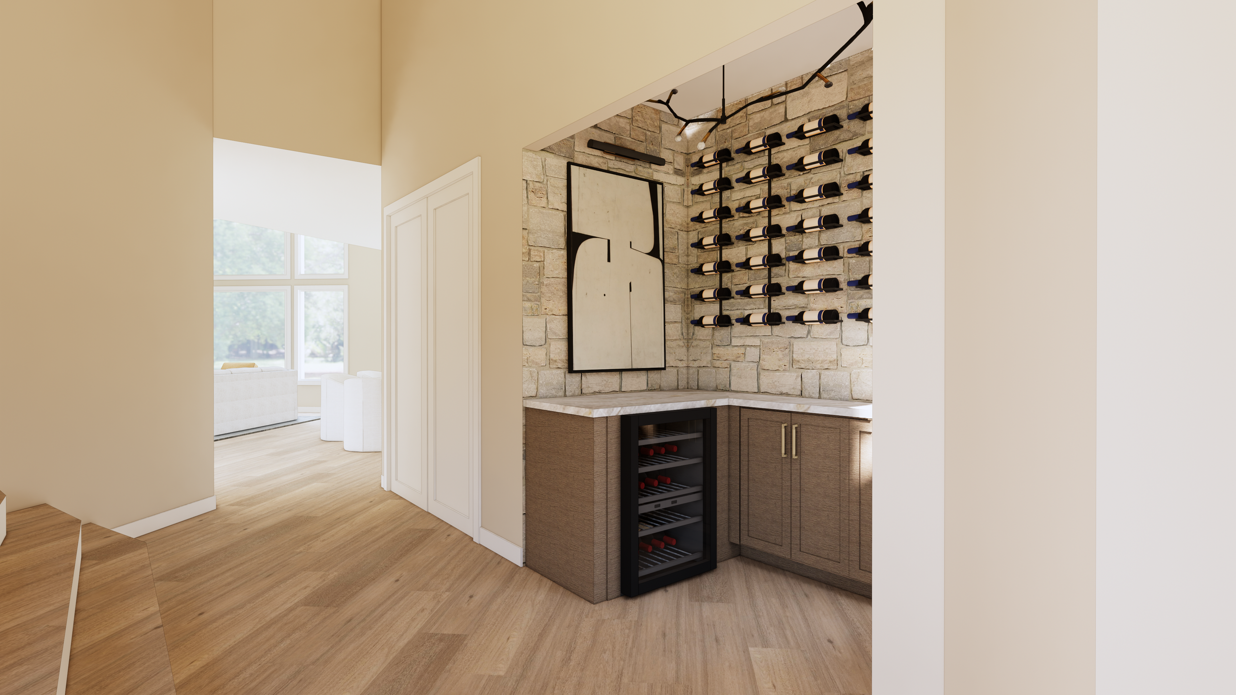 At the entry, a sophisticated wine room was added to elevate the arrival experience for homeowners and guests alike. The overall design follows a transitional style, blending classic and contemporary elements to create a timeless, inviting space. Neutral tones of white and beige, complemented by varied wood cabinetry, set a soothing backdrop that feels both current and enduring.