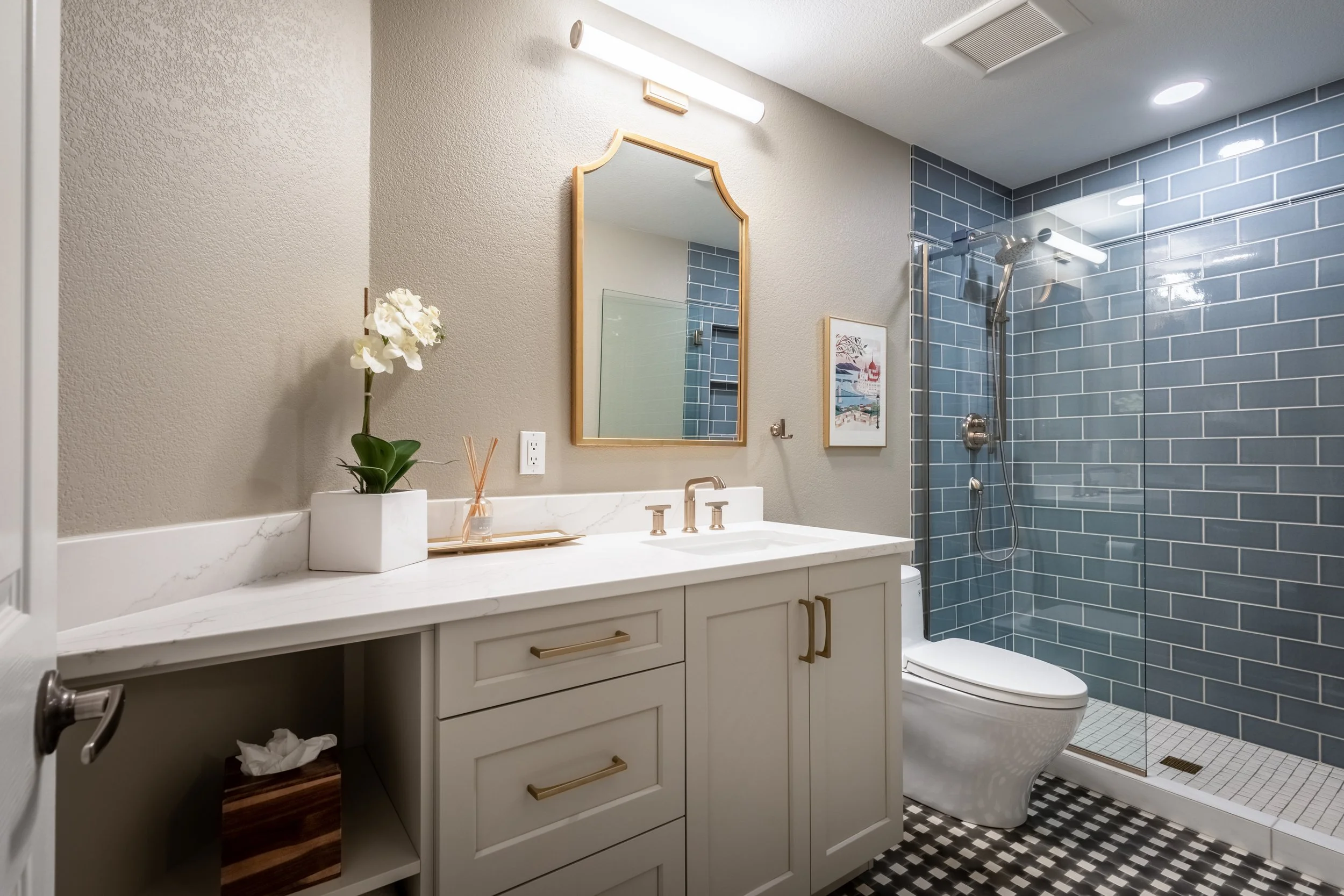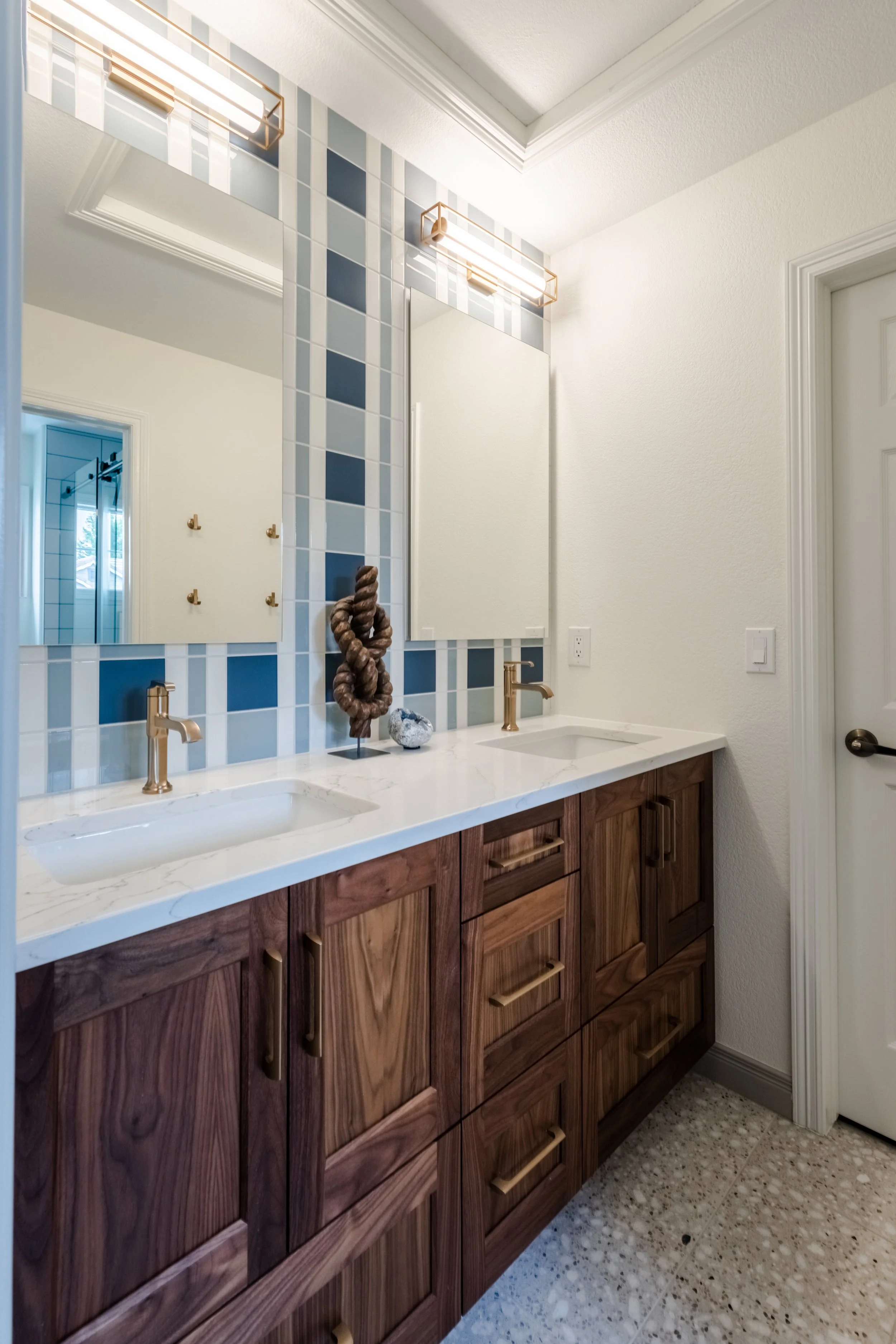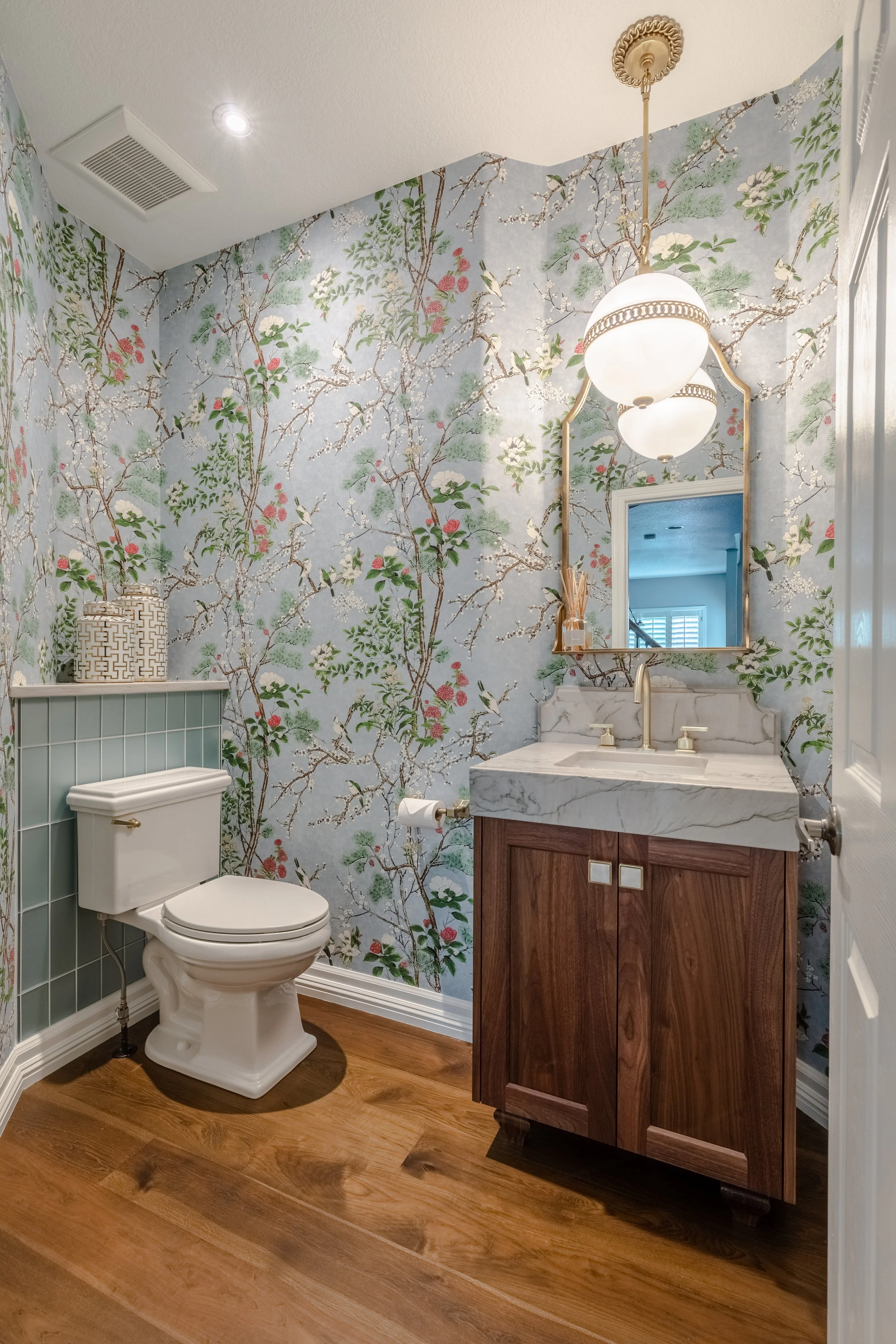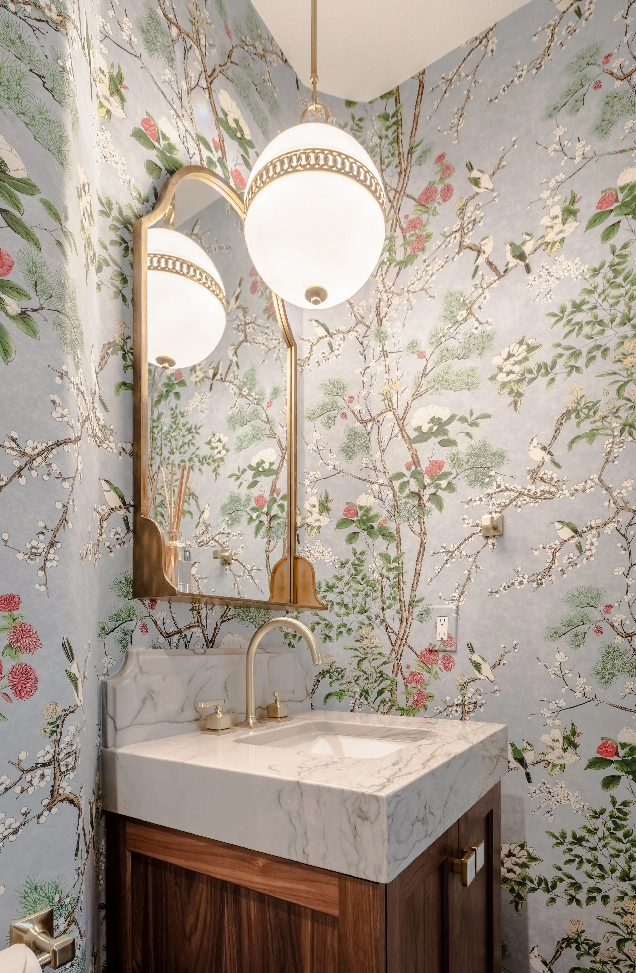 This Heritage Hills, Lone Tree project included 4 bathrooms in Phase I and an add on of the 5th bathroom. A complete refresh of all the bathrooms in this home. Here is a look at the other bathrooms in this project. Thibaut wallpaper, rich walnut cabinetry and customized tile layouts.
