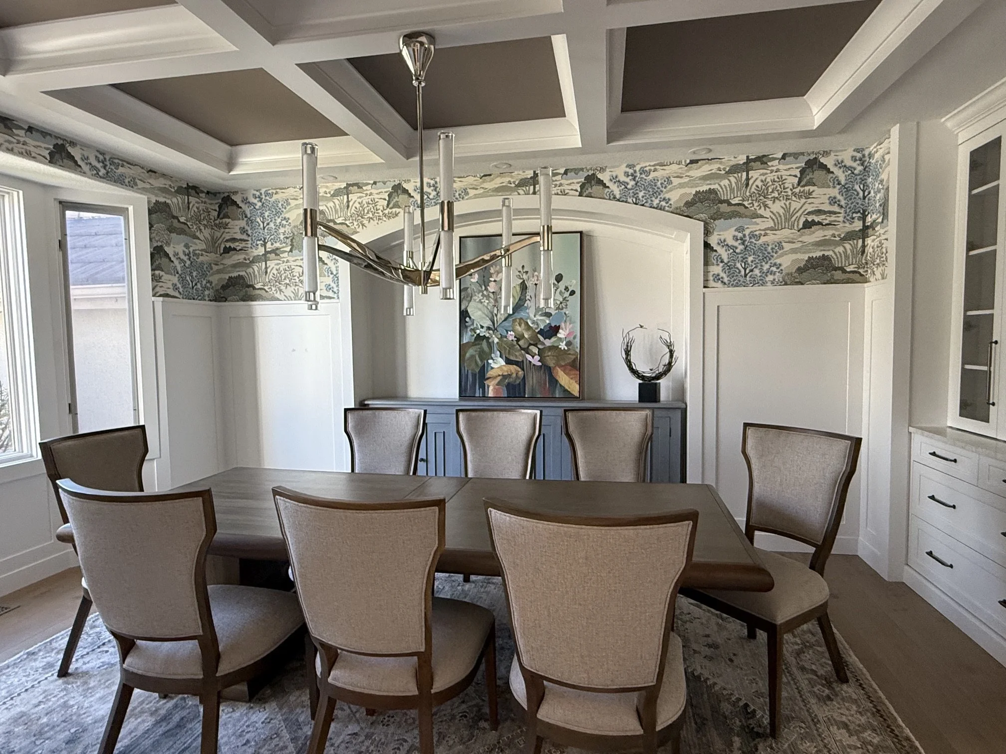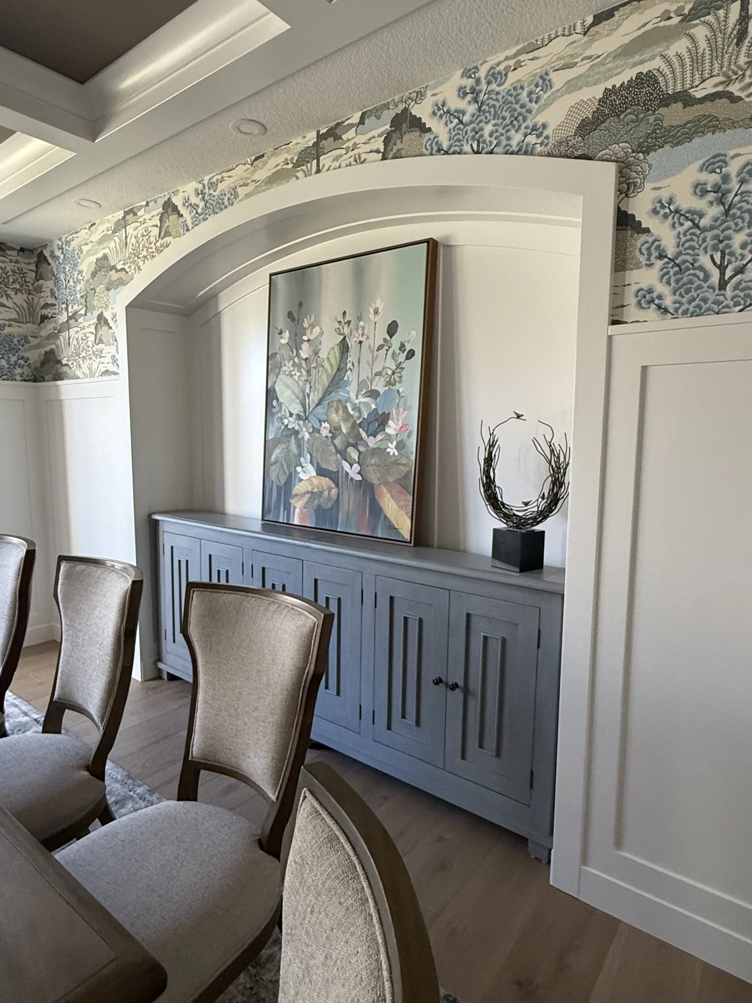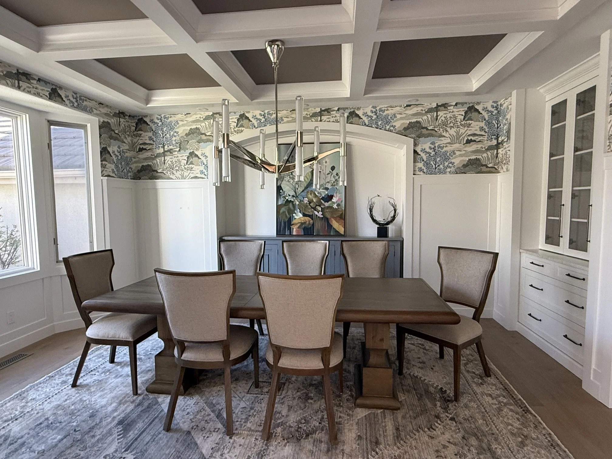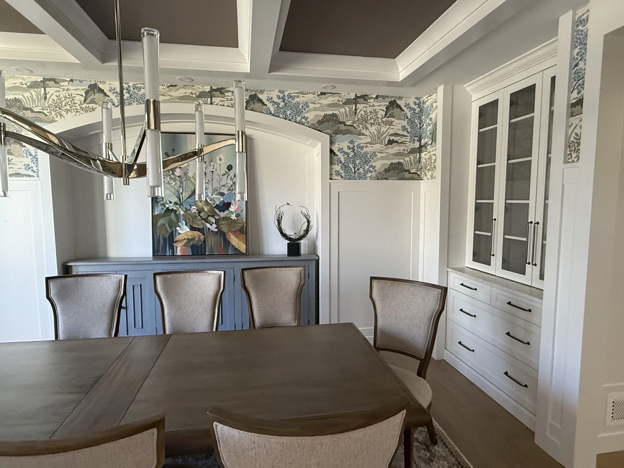 In the dining room, our team introduced finely crafted built-ins as well, with the added allure of wallpaper to infuse character and charm. The dining area now exudes luxury with the installation of a coffered ceiling, and the entire entryway is elevated with floor-to-ceiling wainscoting, creating an inviting and timeless aesthetic. This project reflects a seamless blend of functionality, style, and comfort, enhancing the home's overall character while meeting the unique needs of our client.